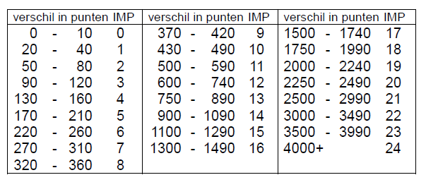 +1 (170) dan is het verschil in de wedstrijd 450 en dat is 10 IMP. Dus ook in viertallen is het bieden van manches heel belangrijk. Uiteindelijk tellen we na afloop alle impen op en het verschil wordt weer uitgedrukt in VIP volgens weer een andere tabel.Als er geen verschil is eindigt een wedstrijd in 10-10. Heb je al een paar IMP loopt het al snel op naar 11-9 of 12-8. Voor een groter verschil moet je minimaal een manche verschil hebben, zeg maar die 10 IMP voor 4